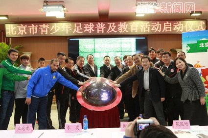 图为与会嘉宾共同开启“北京市青少年足球普及教育活动”按钮。