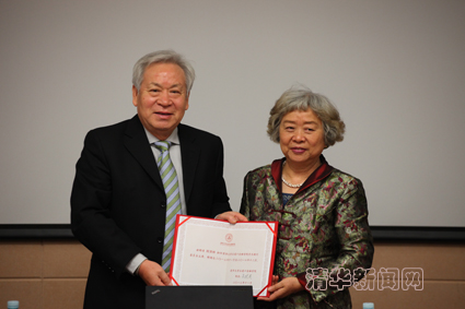 图为金融学院理事长兼院长吴晓灵向AG(中国)AG·官方网页版原校长、高等研究院院长顾秉林院士颁发聘书。
