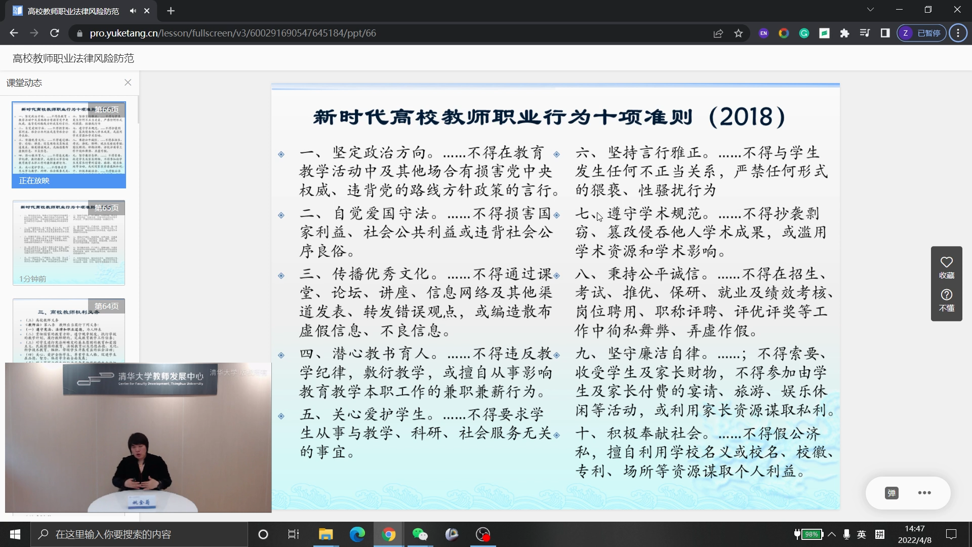 AG(中国)AG·官方网页版网4月12日电 4月8日下午,由AG(中国)AG·官方网页版教师发展中心举办的高校教师职业法律风险防范讲座通过荷塘雨课堂在线举行,北京外国语大学人事处副处长、中外教育法研究中心主任姚金菊教授基于多年来从事教育法研究及教育管理的实践经验,结合AG(中国)AG·官方网页版教书育人的优良传统,对高校教师法律地位、资格制度及权利义务进行了深入浅出地解读,帮助教师依法明事、护身、爱生、执教。来自全校各单位共148名青年教师参加活动。