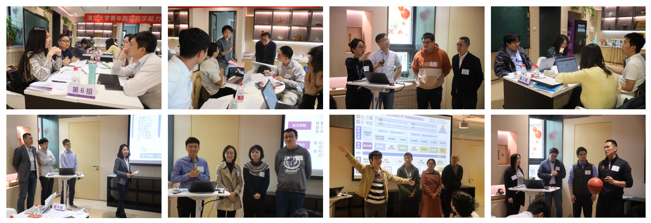 工作坊结束后,参加本次教学能力进阶项目的教师按照八个小组,开展了一场跨学科的教学设计头脑风暴式讨论。小组成员从各自不同学科角度出发,共同探讨、商定选题,设计、打磨了一节课的教学设计,并在17日上午展示汇报了教学设计的成果。八个小组分别就“心理学ABC理论”“结构色”“高维数据可视化”“全球变暖”“体育中的科学与文化”“如何认识人民”“隐私计算”“语义的多样性”等课程主题进行了精彩的教学设计展示,在自动化系教授、教学质量评估中心主任王红和李斌锋的点评和引导下,各小组教师就展示进行了热烈的讨论和充分的交流。