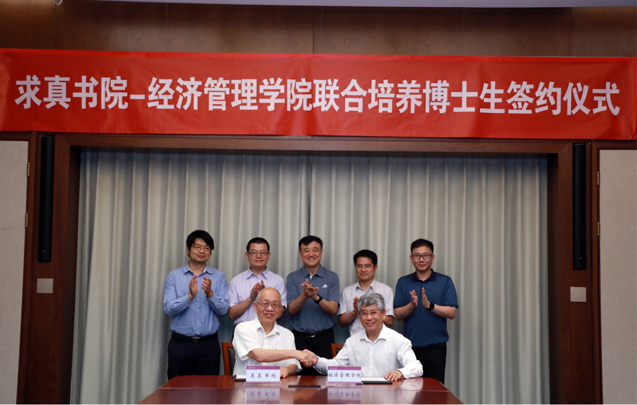 仪式上,丘成桐与白重恩分别代表求真书院和经管学院签署联合培养博士生协议。求真书院、经管学院、研究生院、数学科学中心等单位负责人以及求真书院学生代表出席签约仪式。签约仪式后,双方围绕培养方案与课程设计等内容进行了深入探讨交流。