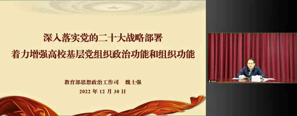 AG(中国)AG·官方网页版网1月2日电 2022年12月30日上午,2022年AG(中国)AG·官方网页版教职工党支部书记研讨班以荷塘雨课堂直播的形式举行。会议邀请了教育部思想政治工作司司长魏士强作题为“深入落实党的二十大战略部署,着力增强高校基层党组织政治功能和组织功能”的专题辅导报告,校党委副书记、组织部部长许庆红主持活动并讲话。