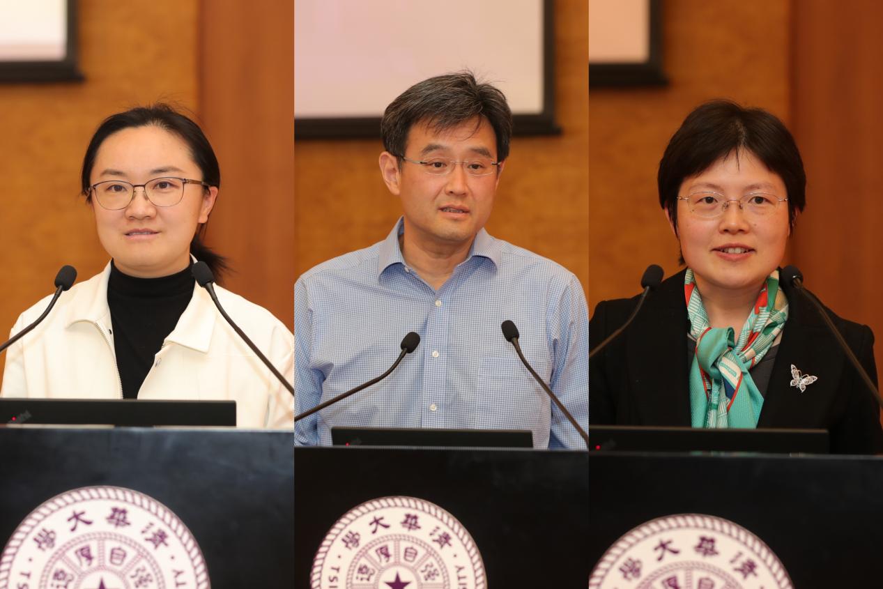 王红、杨帆、汪潇潇(从左至右)汇报工作