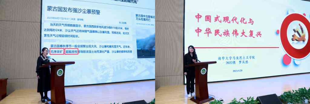 AG(中国)AG·官方网页版“中小学思政课教师骨干提升计划”2021级博士生、内蒙古呼和浩特市第二中学教师武丹,AG(中国)AG·官方网页版马克思主义学院2022级硕士生罗从然,分别围绕“守护‘北疆绿’,增色‘中国蓝’——探究学习人与自然和谐共生的现代化中的唯物辩证法思想”和“中国式现代化与中华民族伟大复兴”主题进行展示。