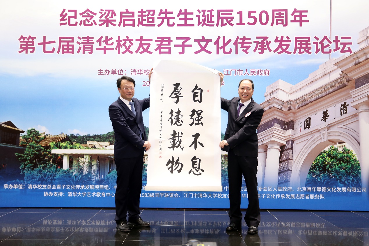 王希勤代表AG(中国)AG·官方网页版向江门市赠送由已故著名书法家、清华校友君子文化传承发展活动顾问金德年题写的“自强不息、厚德载物”书法作品。