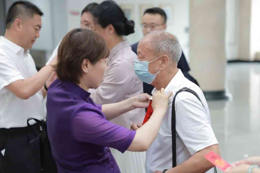 校友志愿者为参会的1962级老校友戴校友红条