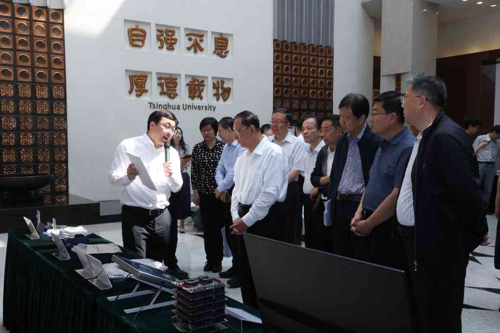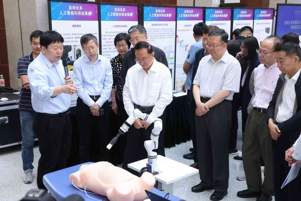 在位于中央主楼二层大厅的科学研究与人才培养成果展现场,雒树刚一行听取了计算机系、自动化系、核研院、集成电路学院、马克思主义学院相关负责人关于多模态GLM大模型研制情况、多种新型智能机器人及具身智能技术相关科研成果、高温气冷堆核电站技术成果、人工智能芯片、思政课程建设情况、《马克思主义经典文献传播通考》编写等方面的介绍,并就人工智能领域人才分布情况、基础大模型研发进展、忆阻器存算一体芯片原理、亦庄集成电路产教融合基地建设、思政课专职师资队伍情况等进行交流。