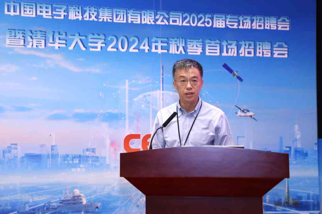 在中国电子科技集团有限公司2025届专场招聘会上,史宗恺代表学校对李守武一行表示欢迎。他表示,今年是中国第一颗原子弹爆炸成功60周年、“两弹一星”精神提出25周年,“两弹一星功勋奖章”获得者、清华校友邓稼先和朱光亚诞辰100周年。长期以来,有一大批像邓稼先、朱光亚学长一样的清华人在国防科工领域扎根奉献,为国家自立自强奋斗一生。希望清华学子能够在前辈的感召下,坚定报国志向,投身国防科工,到党和国家最需要的地方发光发热、贡献力量。