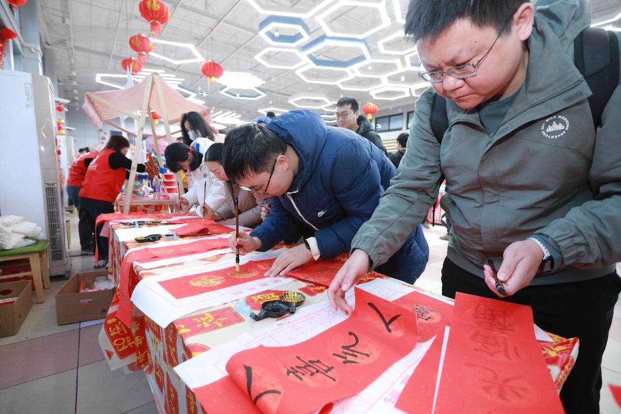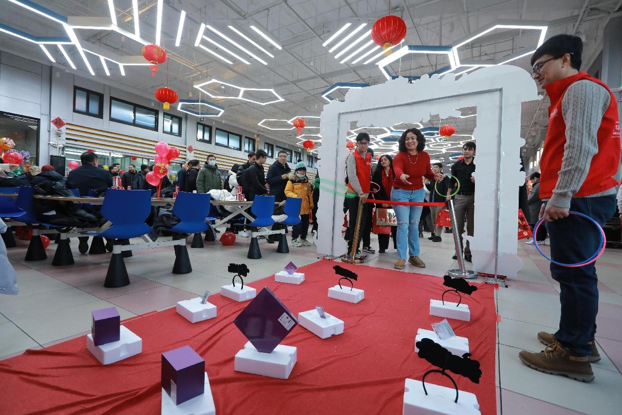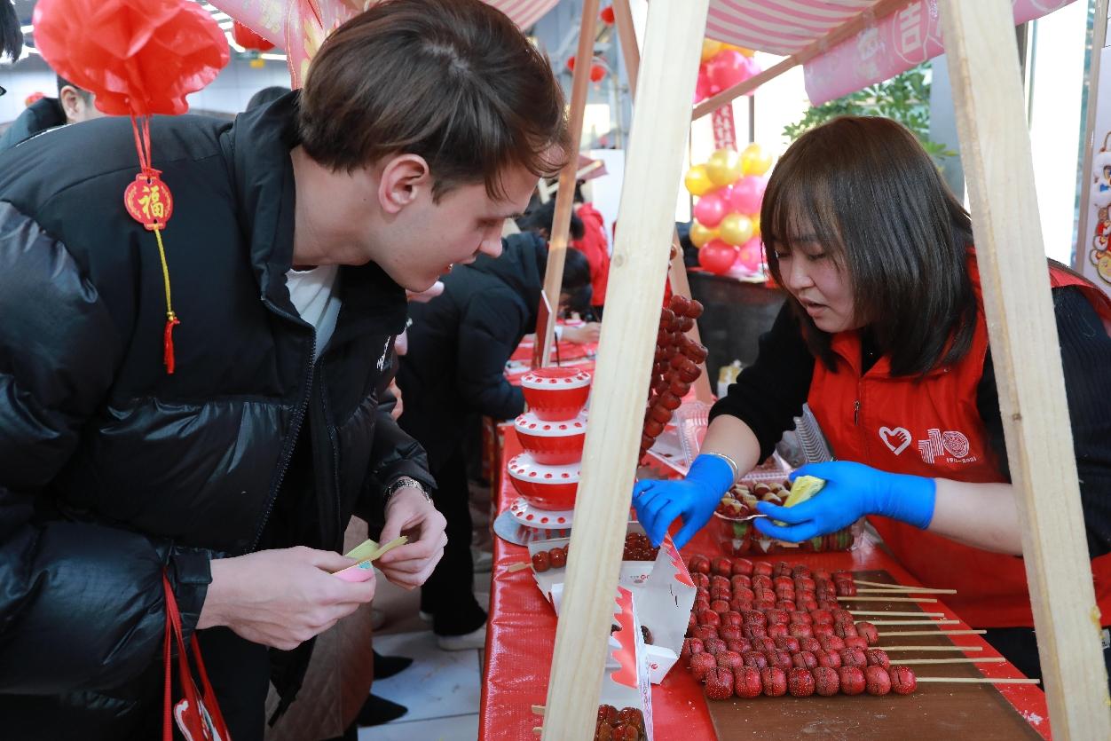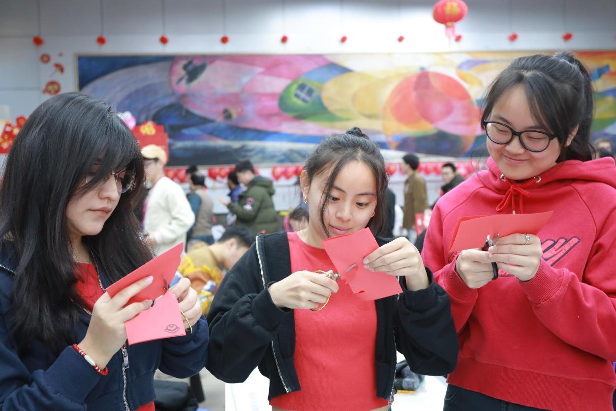 现场还设置了拓写春联福字、手工剪纸窗花、制作冰糖葫芦、新年灯谜竞猜等传统形式的年味活动,吸引了中外留校同学们驻足观摩、亲手体验。