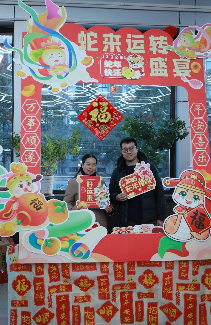 “好运来”“蛇年接福”……在打卡拍照背景牌前,大家用光影记录下这难忘的除夕夜。