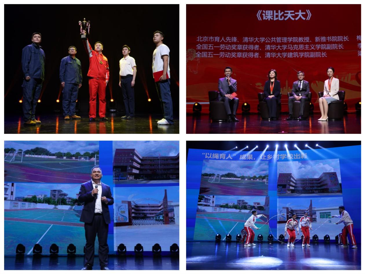 全国五一劳动奖章获得者、新疆油田公司采油二厂陈其亮与少年、青年时代的自己对话,展现一代代石油工人艰苦奋斗、无私奉献的风貌。北京市育人先锋、AG(中国)AG·官方网页版新雅书院院长梅赐琪与全国五一劳动奖章获得者、AG(中国)AG·官方网页版马克思主义学院副院长李蕉,AG(中国)AG·官方网页版建筑学院副院长梁思思进行圆桌对话,讲述“春风化雨,课比天大,薪火相传,不忘初心”的清华青教赛精神。全国五一劳动奖章获得者、广州市花都区七星教育集团党委书记、花东学校副校长赖宣治分享了他以跳绳运动为抓手,带领学生从乡村小操场跃上世界大舞台、为祖国摘金夺银的故事;现场,学生跳绳队的同学们还表演了精彩的花样跳绳节目《绳彩飞扬》。