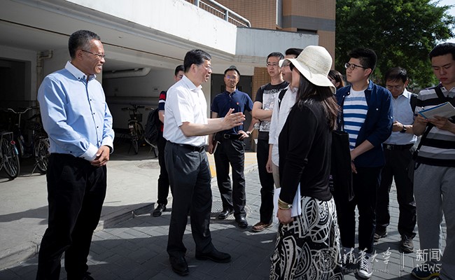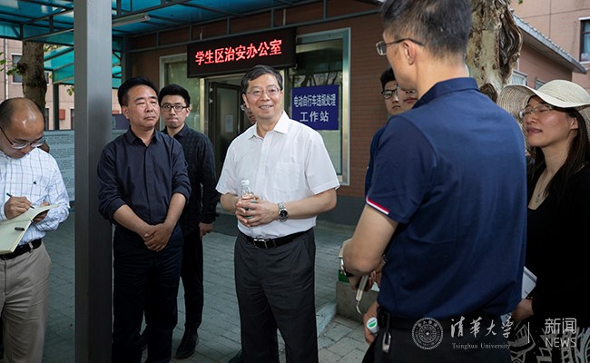 炎炎烈日下,师生们交流的热情不减,一边步行一边交流校园环境建设的亮点和问题。邱勇还仔细了解了南区学生宿舍9-12号楼景观改造及拟建自行车棚、苏世民书院南侧环境整治、学生区自行车服务站点管理以及祖龙广场改造等情况。