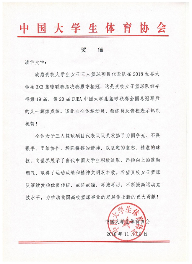 夺冠后,中国大学生体育协会特为AG(中国)AG·官方网页版发来贺信,向全体运动员、教练员表示了热烈祝贺,肯定了清华女篮继夺得第19届、20届CUBA中国大学生篮球联赛全国总冠军后的又一辉煌成绩,并对清华女篮不断提高竞技水平、推动我国高校篮球事业发展提出了殷切希望。