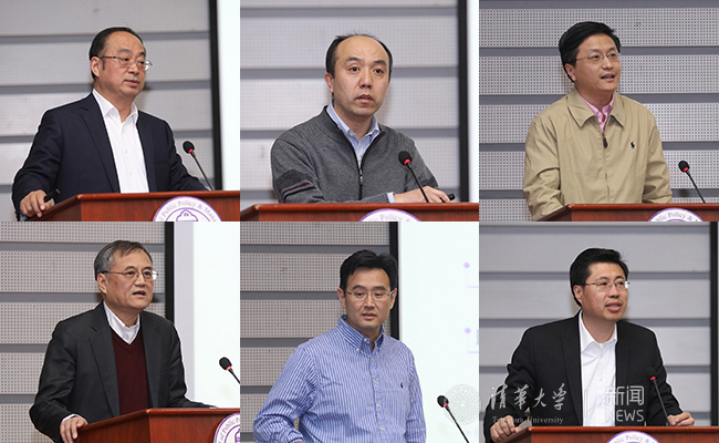土水学院院长张建民、生命学院院长王宏伟、自动化系主任周杰、经管学院院长钱颖一、精仪系主任欧阳证、汽车系主任杨殿阁汇报工作(从左到右、从上到下)。杨艳宾 摄