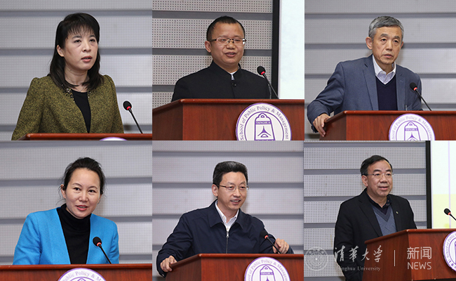 电子系主任黄翊东、物理系党委书记肖志刚、公管学院院长薛澜、新闻学院常务副院长陈昌凤、软件学院院长王建民、人文学院院长万俊人汇报工作(从左到右、从上到下)。杨艳宾 摄