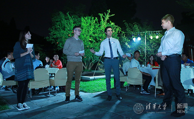 学生艺术团民乐队严晨同学的中阮独奏《火把节之夜》, 将茶话会推向了第一个小高潮。来自美国的罗凯、哥伦比亚的大卫、俄罗斯的伊万、意大利的张子涵四位国际学生为大家朗诵了《念奴娇·过洞庭》和《木兰花慢·可怜今夕月》,通过他们娴熟的汉语朗诵出来别有一番韵味。来自台湾地区的陈颖同学声情并茂地朗诵《荷塘月色》,表达了对在清华园学习生活的感念之情。