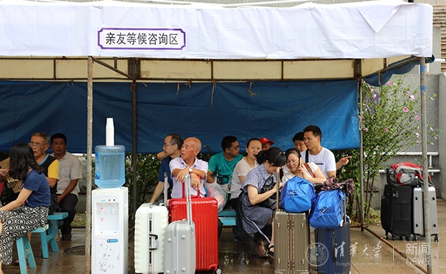 在综合体育馆南门西侧,学校今年新开设了亲友等候咨询区,提供宣传材料、纪念笔和饮用水。在新架设的帐篷内,聚坐一起的学生亲友们惬意地交谈,等候孙辈的爷爷奶奶们在此乘凉,拖着行李箱的家长也找到了歇脚的好地方。