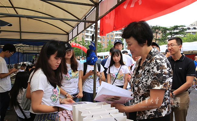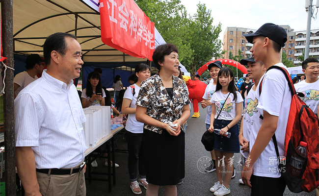在数理类迎新点,邱勇向工作人员仔细询问了新生报到情况以及大类招生后的相关工作,并对报到新生表示欢迎,鼓励他们在清华追逐自己的梦想。