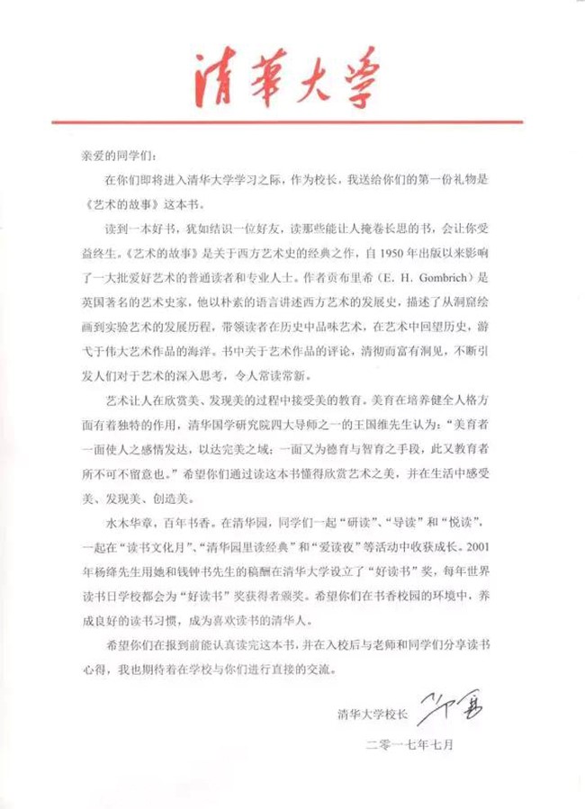 之所以选择《艺术的故事》,邱勇在致新生的信中引用清华国学研究院四大导师之一王国维先生的话:“美育者一面使人之感情发达,以达完美之域;一面又为德育与智育之手段,此又教育者所不可不留意也”。邱勇指出,艺术让人在欣赏美、发现美的过程中接受美的教育,美育在培养健全人格方面有着独特的作用。他向全体2017级本科新生发出号召,希望同学们在入学报到前认真读完这本书,并在入校后与老师和同学们分享读书心得,通过读这本书懂得欣赏艺术之美,并在生活中感受美、发现美、创造美。