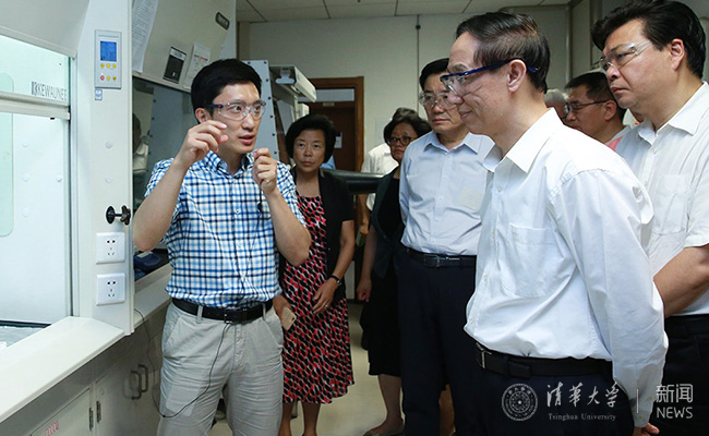 王家瑞等领导在调研过程中不时询问相关技术细节和产业化具体情况。王家瑞对鲍捷的技术成果及产学研进展给予了充分肯定,希望清华继续加大创新力度,围绕国家重大战略需求着力攻破核心关键技术,为把我国建设成创新型国家、世界科技强国不懈努力。