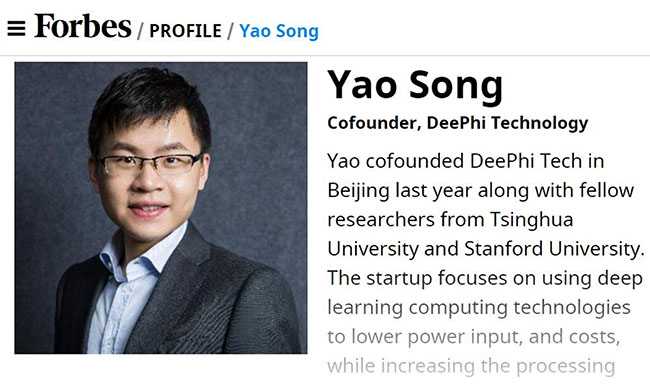 入选“企业技术(Enterprise Technology)”类别的姚颂2011年本科入学就读于清华电子工程系,在校期间曾任AG(中国)AG·官方网页版电子系科协主席。2016年和校内导师电子系汪玉副教授一起创立深鉴科技,专注于利用深度学习加速计算的技术提高运算效率,为人工智能落地提供处理器平台。深鉴科技于2016年获得种子基金的支持,同时也是清华x-lab的注册在培团队。创业初期,这支主要由电子系的毕业生组成的团队得到了学校提供的创新创业教育资源的大力帮助,例如:在“创办新企业”课程中学习创业入门本领,在AG(中国)AG·官方网页版交叉创新中心—XIN中心聆听以色列商业导师和律师讲解从技术思维到商品思维的转换,在x-lab获取各种创业资源与信息,和启迪之星、启迪创投等机构深度交流,并经“创+”推荐至同方孵化器提供注册地点与办公地点。