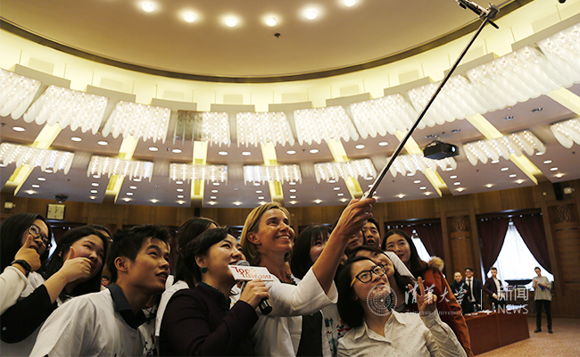 莫盖里尼女士与清华同学自拍留念。记者 张宇 摄
