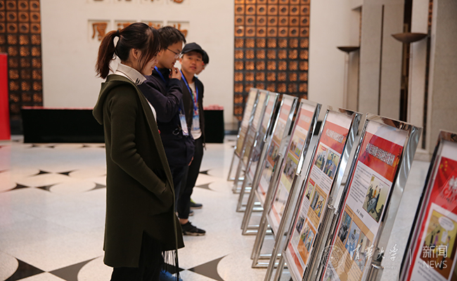 同学们在宣传展板前观看交流。