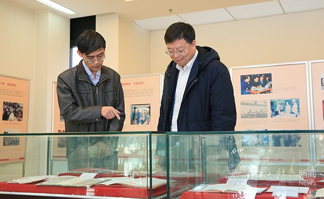 邱勇首先在一楼大厅观看了“为党的教育事业奉献一生——纪念李传信同志诞辰90周年展览”,认真观看每一块展板、每一件实物。接着,来到校史馆3楼会议室,与校史馆全体工作人员座谈。