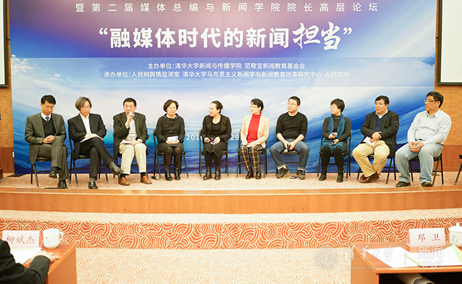 在随后举行的第二届媒体总编与新闻学院院长高层论坛上,业界的媒体总编、部分新闻院系的院长围绕“融媒体时代的新闻担当”、“融媒体时代的新闻教育与人才培养”两个议题进行了深入对话和互动交流。