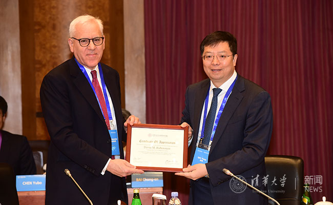 会议开始前,邱勇代表清华经管学院顾问委员会向离任主席、凯雷投资集团联合创始人兼联席首席执行官大卫·鲁宾斯坦(David M. Rubenstein)颁发感谢证书。