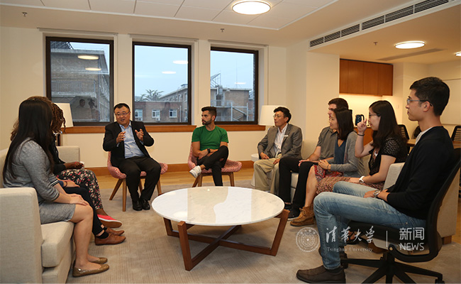 副校长杨斌与苏世民书院新生交谈。