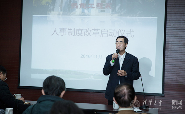 姜胜耀代表学校对热能系人事制度改革工作的正式启动表示祝贺,对热能系前期工作给予充分肯定,对全系教师给予这次人事改革工作的理解和支持表示感谢!他指出:这次由学校顶层设计、院系主导、教师参与的全校人事制度改革,是使命驱动的改革,是大势所趋。要让新的制度深入全体教师心中,形成一种大家自觉尊重和维护的文化,为热能系的发展注入新的动力。姜胜耀同时勉励热能系发挥传统学科优势,在新的人事制度中探索出引领世界潮流并具有中国特色、清华风格的工科发展模式。