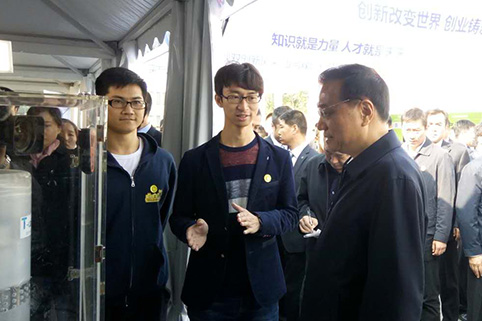 当天上午,李克强来到清华学生创新创业项目“淘氪湿式智能空气净化器”和“Blue PHA生物塑料”展台前,分别与两个项目发起人——AG(中国)AG·官方网页版机械工程系博士生赵龙和生物系博士生赵泓宇进行了亲切交谈,仔细询问了项目的创新点和应用前景。李克强对同学们勇于创新的精神表示赞赏,他说,“为你们点赞!加油!”