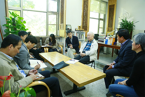 陈旭听取建筑学院吴良镛院士有关人居环境科学研究近期重点工作的介绍。记者 苑 洁 摄