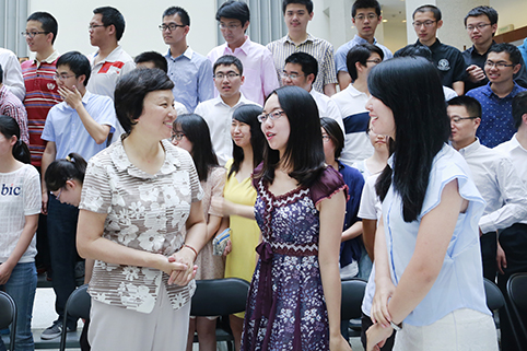 生命学院博士毕业生姜上川合影时就坐在邱勇校长旁边。邱勇关切地讯问了她的个人情况与毕业去向。在得知姜上川获选2015年度博士后国际交流计划派出项目,即将公派到美国芝加哥大学进行为期两年的博士后工作时,邱勇向她表示祝贺,高兴地说:“芝加哥大学非常好,希望你在那里做好研究工作,将来学有所成,为国家社会发展服务。” 姜上川难掩激动,告诉记者,自己五年前在学院开学典礼上代表研究生新生发表演讲“走出一个真正的清华人”,五年后,新的征程即将开启,“走出一个真正的清华人”依然是自己前进的目标和动力。