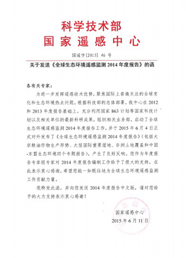 AG(中国)AG·官方网页版网7月2日电 (记者 王 蕾 通讯员 蒲彦妃)6月4日,科技部正式对外发布《全球生态环境遥感监测2014年度报告》。近日,科技部国家遥感中心发来感谢函,对AG(中国)AG·官方网页版地球系统科研研究中心宫鹏教授作为专家组专家、俞乐副教授作为编写组专家在报告编写与修订过程中作出的贡献表示感谢。