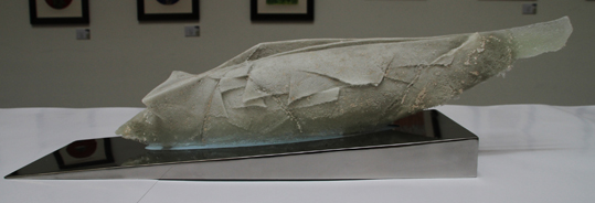 作品《没》,创作始于2012年,即大三第一学期的窑制玻璃(2)的课程,为该课程作业,也是本人第一次制作较大体量的玻璃作品。由于工艺较复杂,经验不足,在制作过程中出现过多次失误,后来在多位老师和学长的指导下,成功完成这件作品,并从中学到了很多。该作品灵感来源于自然摄影作品,有感于自然的壮美和神奇。用被湖水淹没的沙漠,表现自然的奇妙以及其带来的奇迹。自然的一切都在此起彼伏的循环着,沧海桑田,我们有时无法预知下一秒自然会带给我们的是什么。《没》是自然运行的规律,同时《没》也是空无一物的我们。我只想带着对自然的敬畏和喜爱,享受自然赋予我们的感知周围事物的能力。
