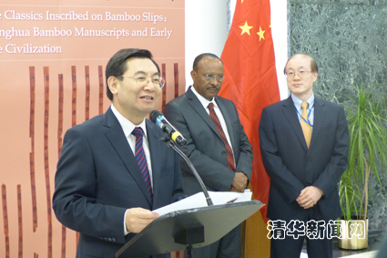 图为胡和平出席清华简展览并致辞,联合国副秘书长盖图(左二)、中国常驻联合国代表刘结一出席开幕式。