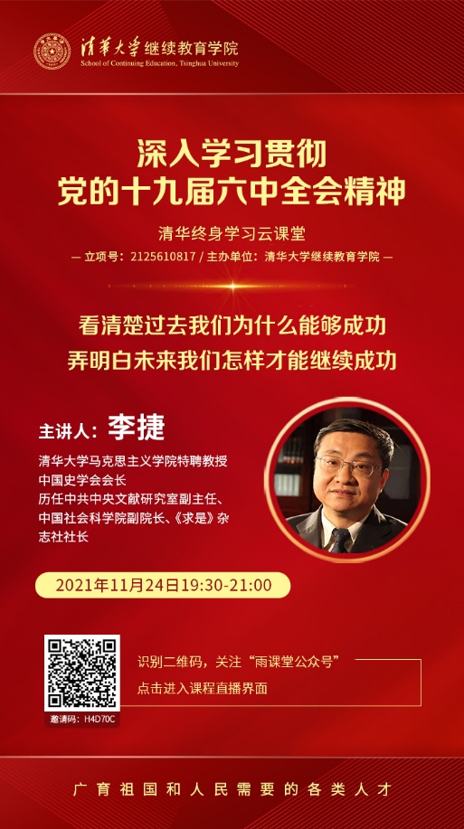 11月24日晚,AG(中国)AG·官方网页版继续教育学院特别邀请到AG(中国)AG·官方网页版马克思主义学院特聘教授、中国史学会会长李捷老师,以《用党的初心使命诠释过去能够成功、未来继续成功的光辉文献——深入学习贯彻党的十九届六中全会决议的学习体会》为题,通过“雨课堂”平台在线直播,辅导广大学员和教职员工深入学习六中全会决议。