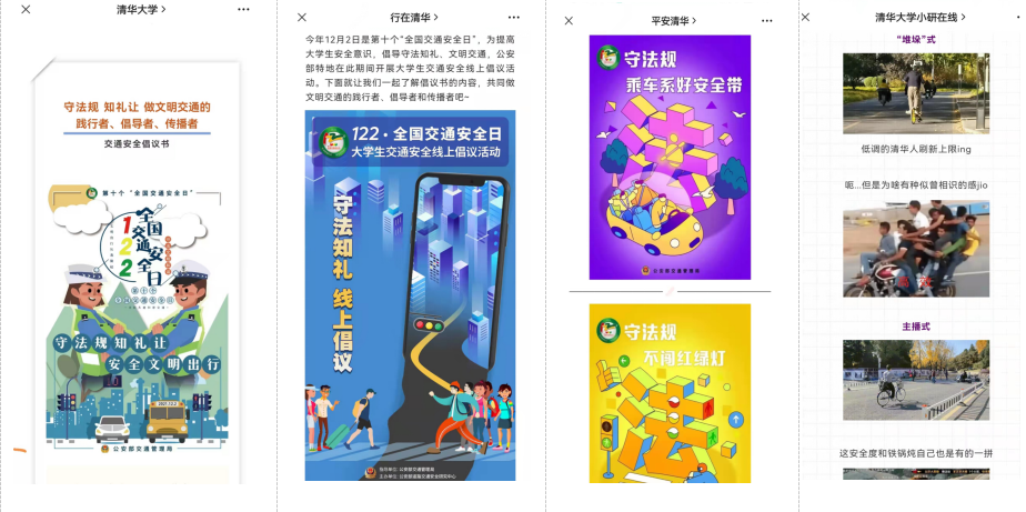 “减速慢行,礼让斑马线”线下路演,倡导校园慢行。11月21日,围绕第17个世界道路交通事故受害者纪念日,“行在清华”等微信公众号开展“行动起来、减速慢行”交通安全事故警示教育。12月2日,在学堂路和清华路的十字路口,保卫处组织人员开展线下路演,对校内快递外卖电动自行车进行测速,超速人员计入校园交通管理系统,对违规骑行人员进行教育提醒,发放宣传材料,共发放宣传材料500余份。