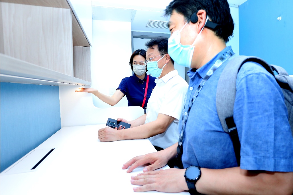 王希勤仔细查看了样板间设计、居住条件和各项设施配备情况,从宿舍储物设计、灯光、桌面高度、床铺梯子设计和安全性,到盥洗池水龙头设计使用,王希勤对每个设施逐一查看、试用,并向设计者和相关负责人详细了解各项设施的情况。王希勤一行还查看了楼宇内的公共活动空间的设计情况。
