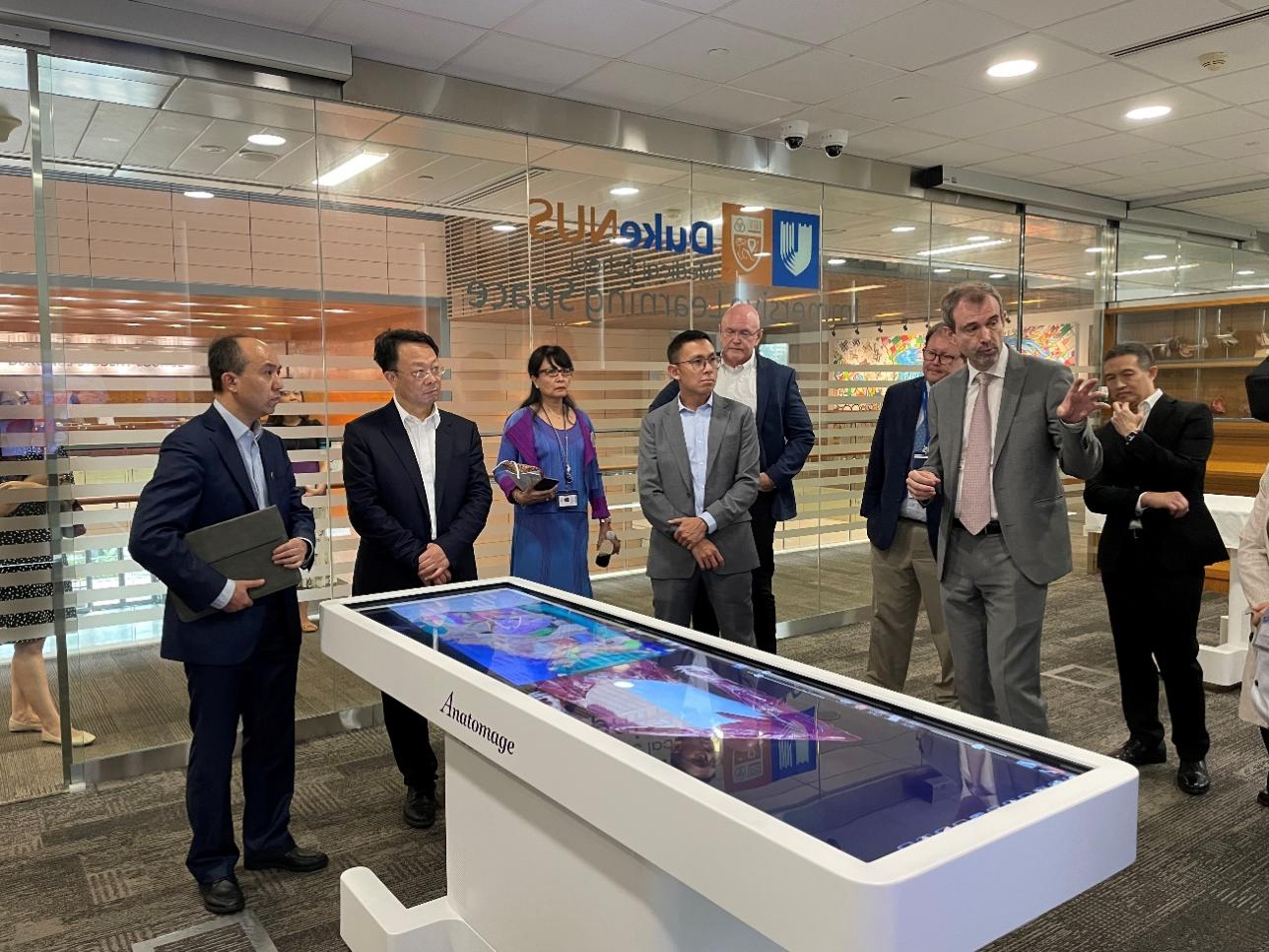 随后,代表团一行到访新加坡国立大学杨潞龄医学院,与医学副校长杨启源(Yeoh Khay Guan)、医学院院长张亚成(Chong Yap Seng)等座谈交流,并在医学领域相关负责人的带领下考察了新加坡国立大学杨潞龄医学院、心血管研究所和健康创新与技术研究所(iHealth tech),与专家教授、研究员以及学生交流互动,详细了解新加坡国立大学在医学领域的科学研究、人才培养、成果转换模式和优秀管理经验。