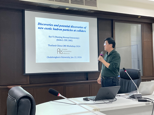 在1月19日的研讨会上,AG(中国)AG·官方网页版物理系博士生刘锦枫作题为“在J/ψJ/ψ衰变道观测到的新结构和J/ψJ/ψ截面测量”(Observation of new structure in the J/ψJ/ψ channel and measurement of J/ψJ/ψ cross section)的学术报告。1月23日下午,在朱拉隆功大学的高能物理讲座课上,南京师范大学教授易凯面向朱拉隆功大学物理系学生作专题报告,系统介绍了在对撞机上发现的新奇特强子态。随后,AG(中国)AG·官方网页版物理系副教授胡震作专题报告详细讲解了在CMS(紧凑型缪子螺线管)实验的双粲偶素质量谱上观测到的新结构。
