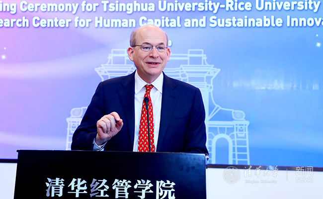经济管理学院院长、联合研究中心管委会主任白重恩在致辞中表示,联合研究中心的使命是汇集知识,汇聚人才,以持续不断的创新思想服务人类。莱斯商学院(Jones Graduate School of Business)和清华经管学院都是各自国家顶尖的经济管理类学术机构,双方优势互补、强强联手,一定会持续不断地为人类社会贡献创新思维。
