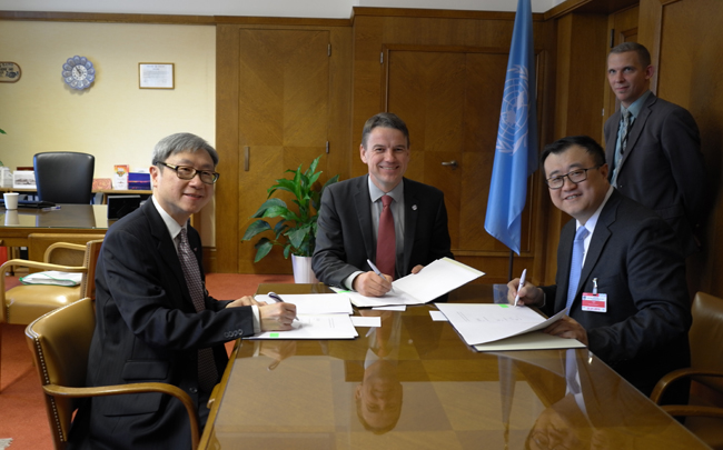 合作各方签署合作协议,左起依次为:香港城市大学副校长叶豪盛、联合国欧洲经济委员会秘书长巴赫(Christian Friis Bach)、杨斌