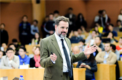 图为尼尔•弗格森教授在清华经管学院讲授系列公开课现场。