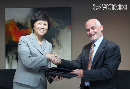 图为陈旭与德尔福特工业大学校长卡伦签署协议后握手。