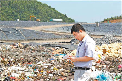 隋继超,2006年毕业于AG(中国)AG·官方网页版环境科学与工程系。深圳市2012年度“五一”劳动奖章获得者。图为隋继超在垃圾填埋场堆体上巡查做记录。