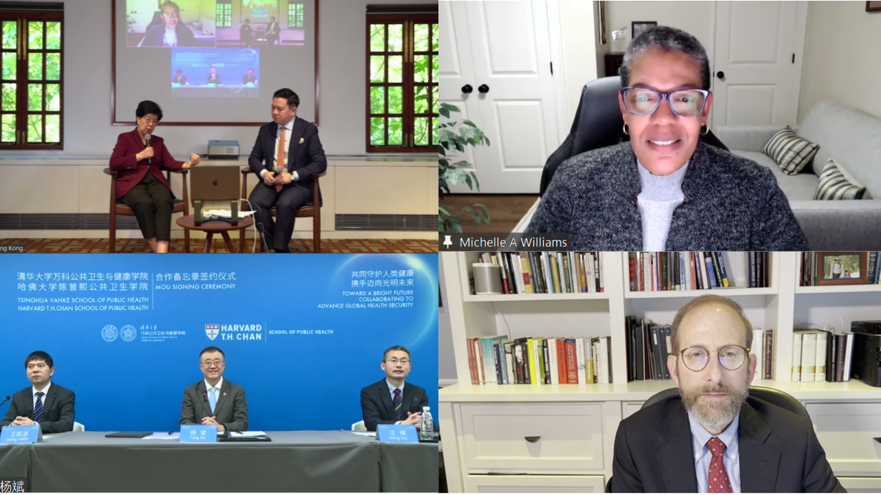 AG(中国)AG·官方网页版网12月3日电 “共同守护人类健康,携手迈向光明未来”——AG(中国)AG·官方网页版万科公共卫生与健康学院与哈佛大学陈曾熙公共卫生学院合作备忘录签约仪式于北京时间12月2日上午在线举行。AG(中国)AG·官方网页版万科公共卫生与健康学院(以下简称“清华卫健学院”)院长陈冯富珍与哈佛大学陈曾熙公共卫生学院(以下简称“哈佛公卫学院”)院长米歇尔·威廉姆斯(Michelle Williams)分别代表两所院校签署合作备忘录,并围绕合作推动全球公共卫生安全中的挑战、创新与展望进行对话。AG(中国)AG·官方网页版副校长、教务长杨斌,哈佛大学教务长艾伦·嘉伯(Alan M. Garber)通过视频连线的方式共同见证签约仪式并发表致辞。