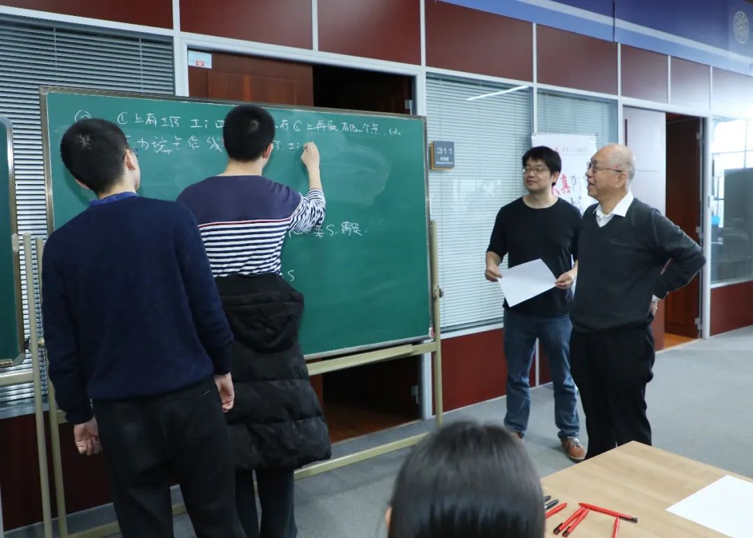 丘成桐(右一)、李思(右二)与同学们交流